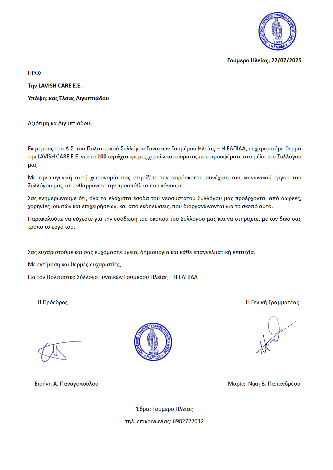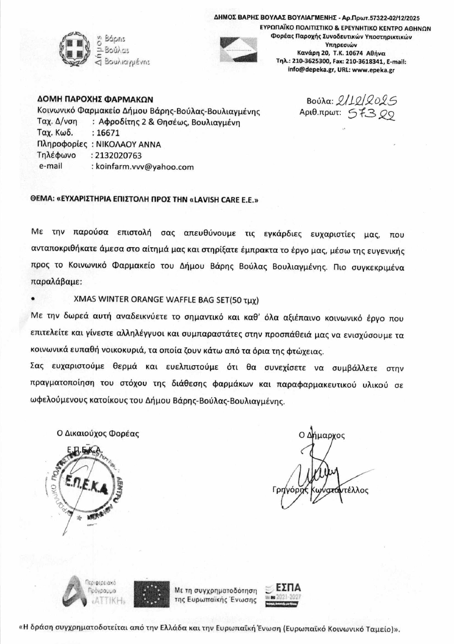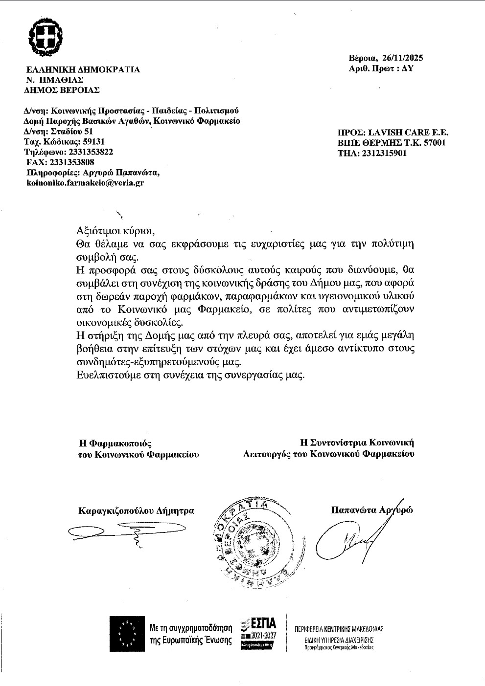 Στη Lavish Care, πιστεύουμε πως η επιτυχία μιας επιχείρησης δεν μετριέται μόνο με οικονομικούς δείκτες, αλλά και με τον θετικό αντίκτυπο που έχει στους ανθρώπους και την κοινωνία. Γι’ αυτό και στεκόμαστε δίπλα σε φορείς και οργανισμούς που εργάζονται καθημερινά για την υποστήριξη ευάλωτων ομάδων και τη δημιουργία ενός καλύτερου αύριο για όλους.