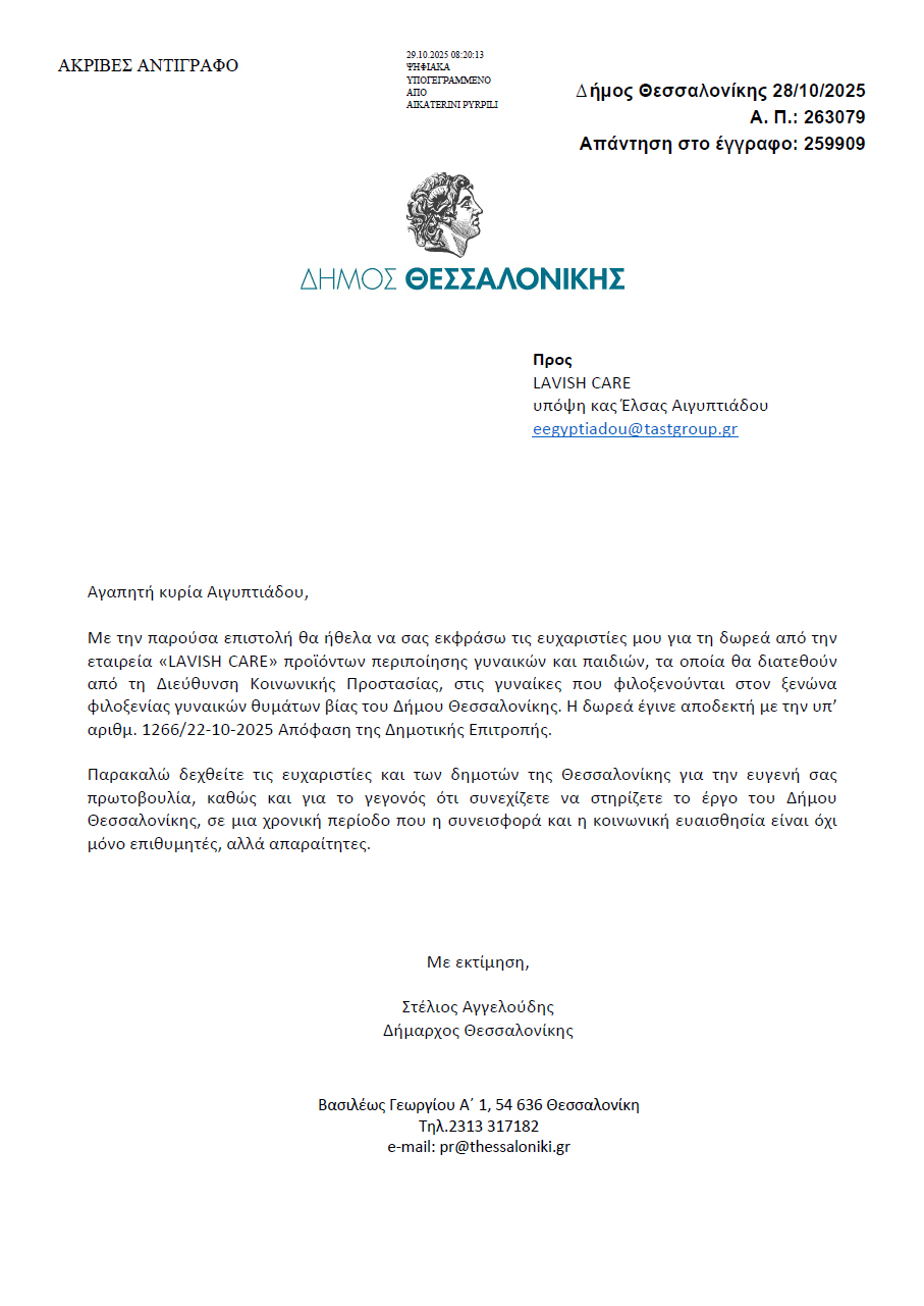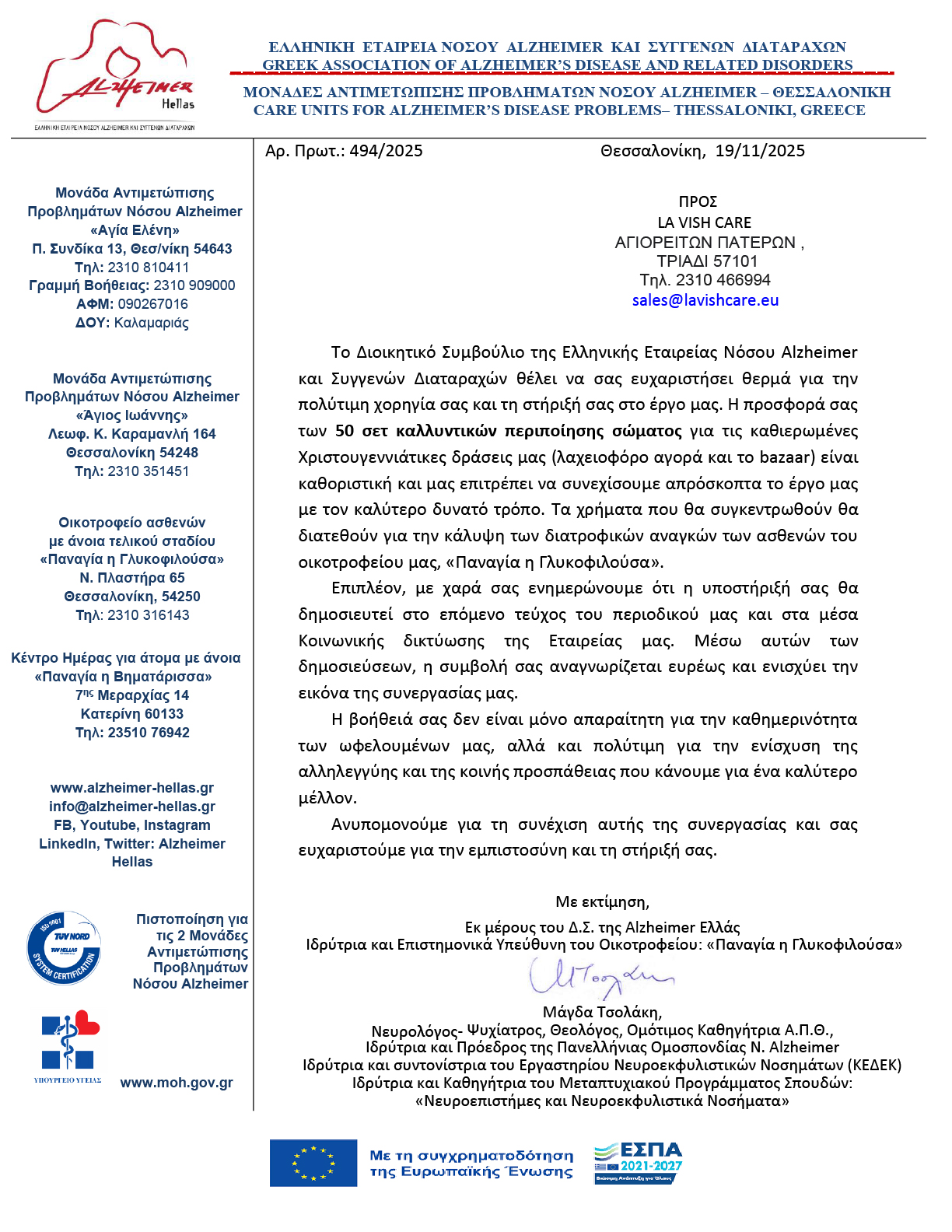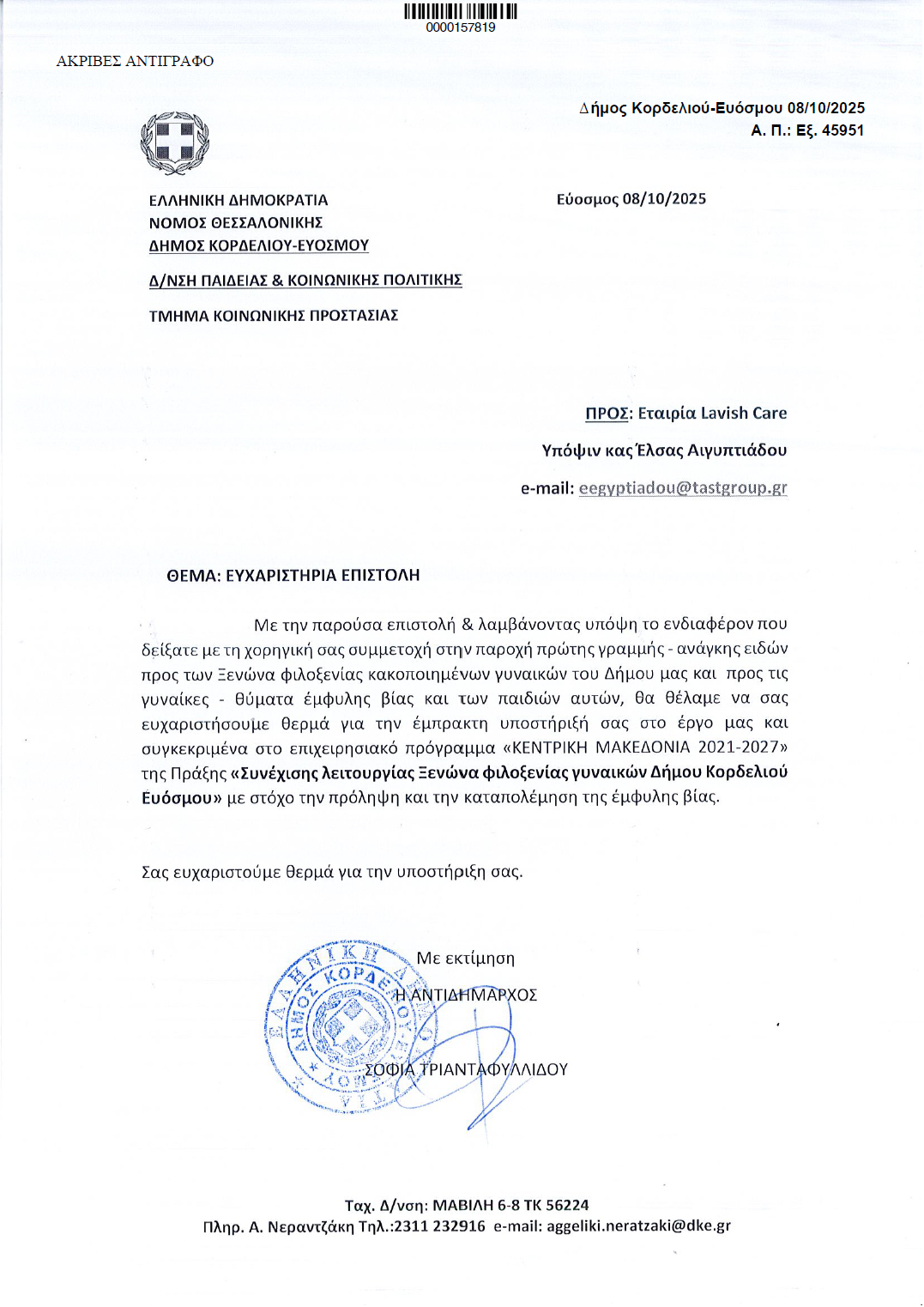 Στη Lavish Care, πιστεύουμε πως η επιτυχία μιας επιχείρησης δεν μετριέται μόνο με οικονομικούς δείκτες, αλλά και με τον θετικό αντίκτυπο που έχει στους ανθρώπους και την κοινωνία. Γι’ αυτό και στεκόμαστε δίπλα σε φορείς και οργανισμούς που εργάζονται καθημερινά για την υποστήριξη ευάλωτων ομάδων και τη δημιουργία ενός καλύτερου αύριο για όλους.